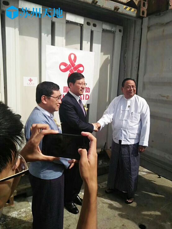 洪亮大使身后貼有“中國援助”標識的即為此次援助緬甸的打包箱安置房