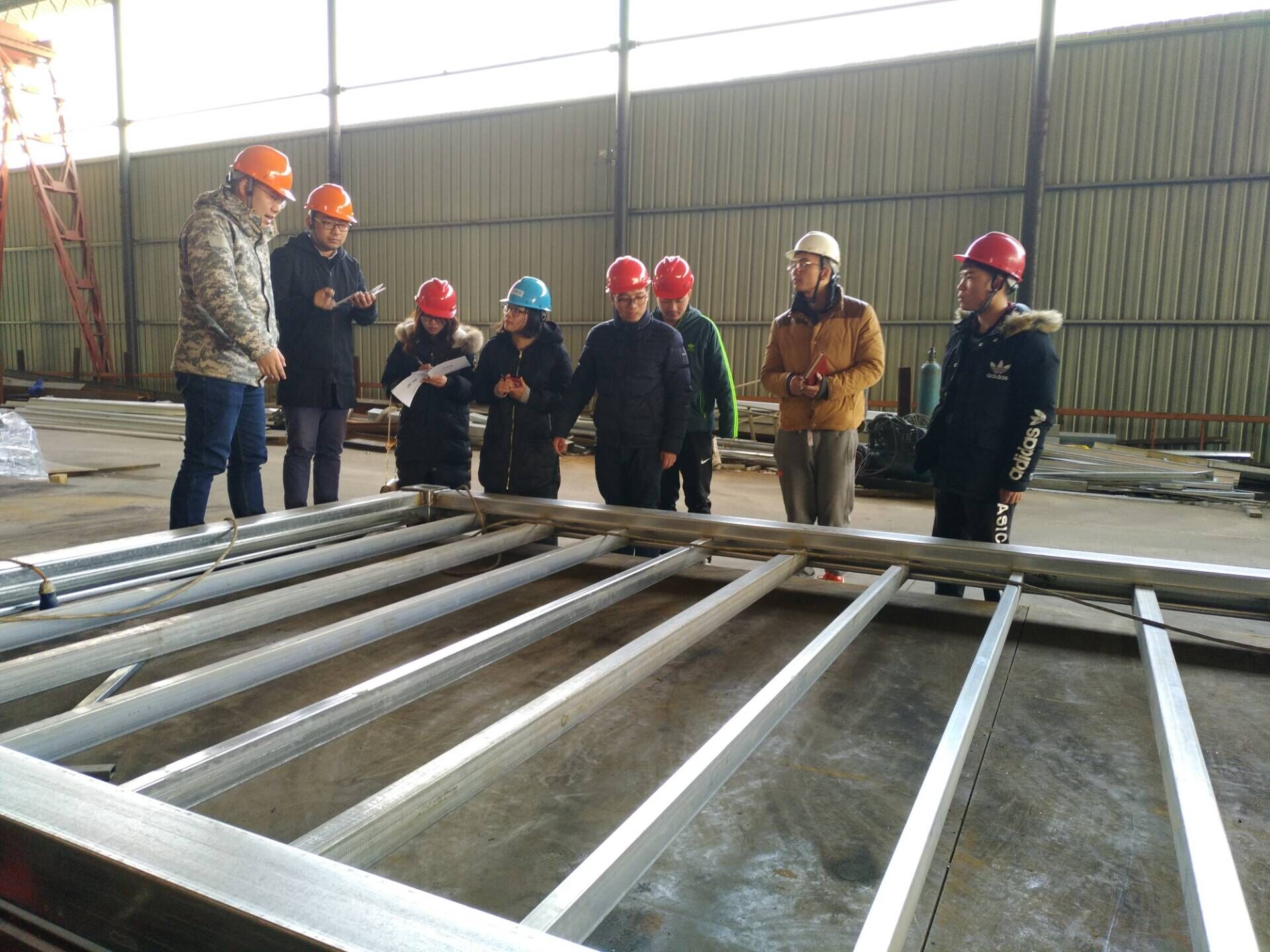3. 成品展示:學(xué)習(xí)完樣品知識后,一行人來到廠區(qū)進(jìn)行實物成品的學(xué)習(xí)。制作好的頂?shù)撞牧,墻板,以及德國?strong>打包箱項目,曹總監(jiān)都事無巨細(xì)的為我們講解。