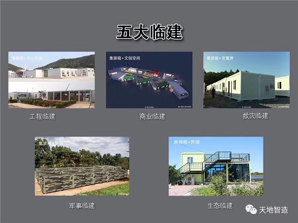 什么是中國臨建?中國臨建是為主體建筑服務的建筑及其它設施(如臨時辦公用房、臨時住宿、臨時售樓處、臨時電力搶修等),工程竣工后,除可以再利用的部分,其它全部拆除。簡單的說,就是為了服務主體工程建造的臨時服務用房。其主打產(chǎn)品打包箱,應為名字叫flat pack container house,屬于中國臨建的一類。那中國臨建的由來呢?2015年,蘇州天地首先提出“中國臨建”的概念,并希望中國臨建能夠帶著責任感成長,嘗試用自己的力量去改變國內(nèi)外參差不齊的臨建市場,為全世界熱愛臨建的心做點有意義的事情。經(jīng)過四年的風雨茉莉,中國臨建成為臨建市場首屈一指的品牌,蘇州天地也成為了國內(nèi)中國臨建綜合解決方案提供商。如今,蘇州天地通過十幾年的技術創(chuàng)新和產(chǎn)品創(chuàng)新實現(xiàn)了標準化、通用化、模塊化、系列化、工廠化的生產(chǎn),以打包箱為主題,形成了滿足客戶不同定制需求的五大臨建系列產(chǎn)品:工程臨建、商業(yè)臨建、救災臨建、軍事臨建以及生態(tài)臨建。