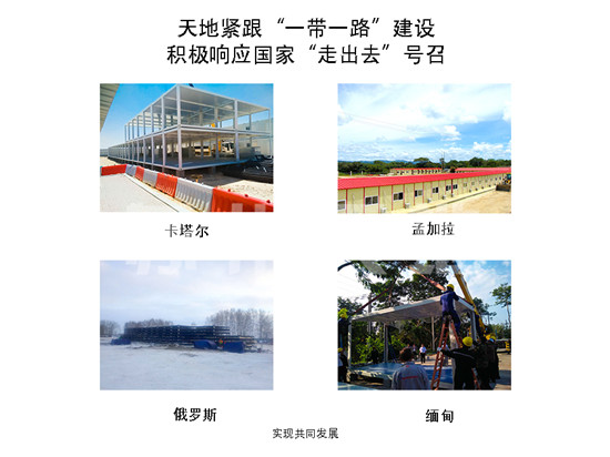 如今,蘇州天地已經(jīng)成為全球工程臨建建設(shè)專(zhuān)家,產(chǎn)品遠(yuǎn)銷(xiāo)全球86個(gè)國(guó)家和地區(qū),先后與孟加拉、卡塔爾、緬甸、俄羅斯、巴基斯坦、越南、尼泊爾等15個(gè)“一帶一路”沿線(xiàn)國(guó)家建立深度合作關(guān)系,向世界展示中國(guó)臨建的品牌形象,成為中國(guó)民營(yíng)企業(yè)踐行“一帶一路”倡議的一個(gè)典型代表。