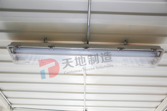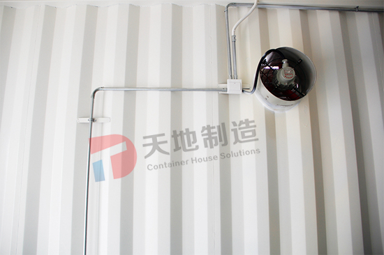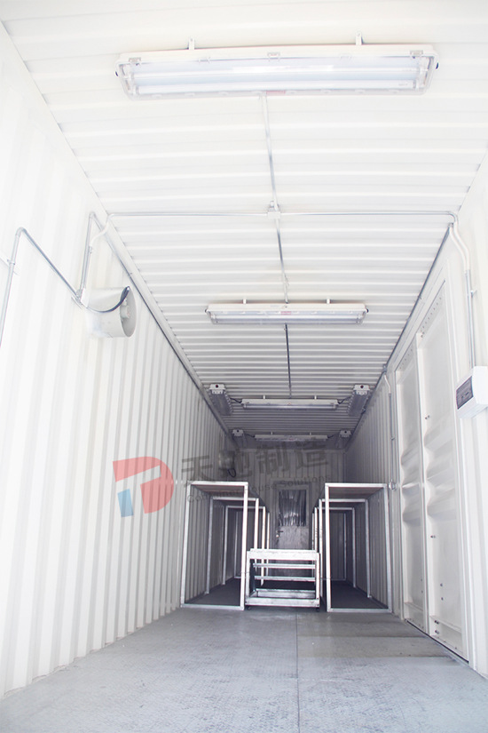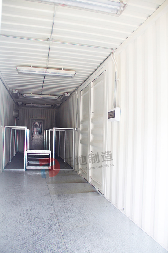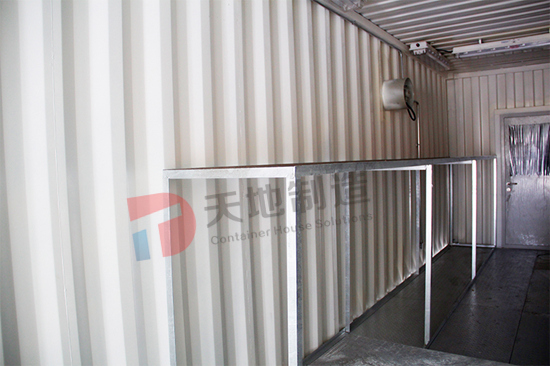 設(shè)備箱總面積90㎡,用3個海運箱左右延伸而成一個狹長的倉庫。倉庫腹地安置貨物架,配備照明設(shè)備,且留有足夠的存儲空間。